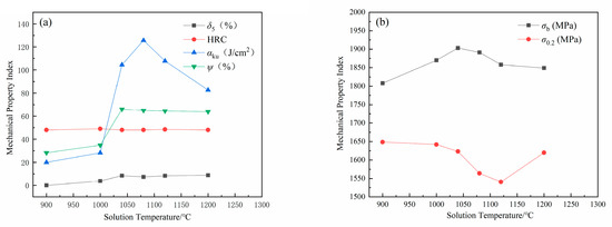 Effects of solution temperature on mechanical properties of S280 steel (a) elongation (δ5), reduction in area (ψ), impact toughness (αku) and hardness (HRC) and (b) tensile strength (σb), yield strength (σ0.2).