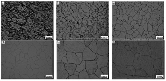 Figure 2 shows austenitic grains of S280 at different solution temperatures. The structure is further coarsened with the solution temperature increasing (Figure 2f). According to initial research and the dissolution of some alloy carbides, the optimum solution temperature is between 1000 °C and 1100 °C. The temperature chosen was 1080 °C because it is high enough to promote excess carbide solid solution and low enough to maintain a relatively fine grain structure. With the increase of solution temperature, the carbide particles at the grain boundary decreased gradually, while the austenite grain size increases due to the lack of pinning effect of carbide at the grain boundary. The large particles precipitated phase migration was blocked at the interface. With the decrease of grain boundary carbides, the grain boundary becomes flat. When the solution temperature is below 1080 °C, the carbides at the interface inhibit the high-temperature growth behavior of austenite grains.