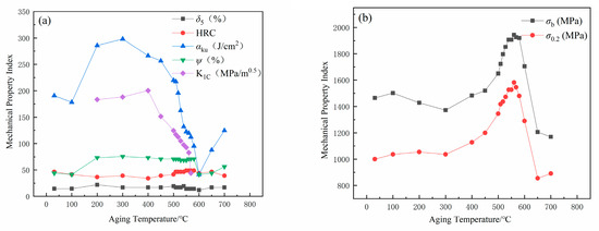 Effects of aging temperature on mechanical properties of S280 steel. (a) elongation (δ5), reduction in area (ψ), impact toughness (αku), fracture toughness (KIC) and hardness (HRC) and (b) tensile strength (σb), yield strength (σ0.2).