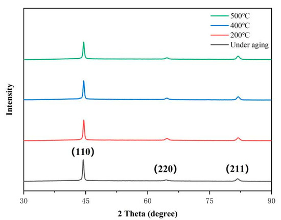 The XRD image of S280 at different aging temperatures is shown in Figure 4. The XRD result shows that there is no obvious phase change before and after aging. There is no obvious peak of austenite in this figure. This shows that the microstructure of the sample is martensite when the solution temperature is 1080 °C, and the aging process is the process of refining martensite lath.