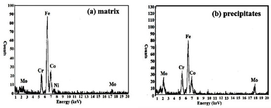The EDS results of the sample aged at 540 °C are shown in Figure 6. It can be seen that the contents of element Cr and Mo in precipitates are significantly higher than that in matrix, indicating that the precipitates may be the compounds of Fe and Cr or Fe and Mo.