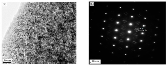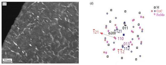 The bright-field image and corresponding dark-field image showing Cr2C precipitates; (b) appear in the diffraction pattern after aging at 560 ℃ (Figure 9). Schematic indexing of the pattern shows //, // (Figure 9d). The transformation matrices A and B of surface and direction index between martensite and Cr2C can be calculated. The surface index and the direction index of the matrix and the precipitated phase are known. Using the matrix calculator, an invertible matrix can be calculated so that the vector obtained by multiplying the matrix with the exponential vector of the precipitated phase is equivalent to the exponential vector of the matrix.