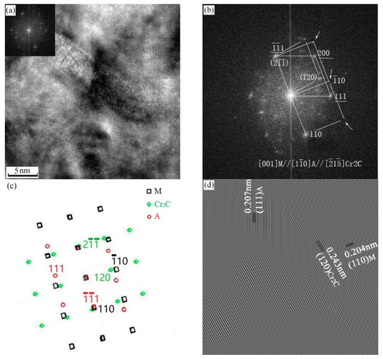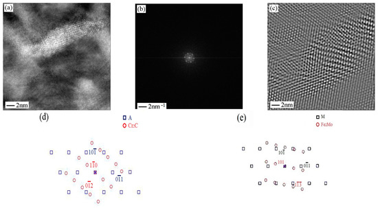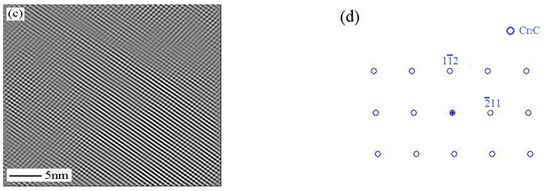 Figure 10 is a high-resolution electron image of strengthening phase Cr2C and Fe2Mo. The diffraction spots of Figure 10b are obtained by FFT transformation from Figure 10a. After the calibration, directions of matrix, Cr2C and Fe2Mo are , and respectively. The lattice image in Figure 10c is obtained by FFT transformation of diffraction spots. It can be seen that Cr2C (length is 12 nm, width is 4 nm) and Fe2Mo (length is 20 to 30 nm, width is 5 nm) retain a coherent lattice relationship with matrix and there is a certain degree of mismatch at the interface of coherent lattice.