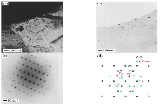 The precipitated phase Fe2Mo is ellipsoid dispersively distributed in matrix (Figure 11). Compared with Cr2C, Fe2Mo has a slightly larger diameter and a smaller volume fraction. The schematic index for this pattern shows //, // (Figure 11d). The transformation matrices A and B of surface and direction index of martensite and Fe2Mo are obtained