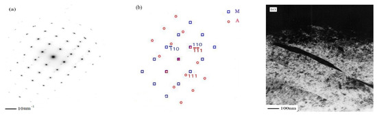 As well as precipitates coarsening, aging at 600 °C results in precipitate/matrix coherency losing and reverted austenite volume fraction coarsening. Figure 13a shows electron diffraction pattern from the reverted austenite close to a [001]M orientation. An appreciable reversion of austenite is observed along plate boundaries; the needles are clearly seen (Figure 13c). The reverted austenite forms primarily at plate boundaries with a Kurdjmov–Sachs relationship. It is indicated that austenite is formed by nucleation and growth because it has no dislocation.