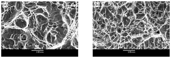 The research of toughness variation during aging indicates several important trends. The toughness of quenched steel is high because of low strength, absence of coarse inclusions and residual austenite at the plate boundary. Thomas first demonstrated the beneficial effect of retained austenite on toughness [24]. Aging at 540 °C, strength and toughness are well combined because of fine Fe3C, the formation of thin-film reverted austenite and the uniform precipitation of Cr2C. Its toughness is comparable to quenched and cryogenically treated steel, but the strength is much higher, so it has a higher strength/toughness ratio. The reverted austenite has a thin-film morphology which is similar to the retained austenite observed in quenched steels [24]. Coarsening of austenite at lath boundaries allows for some degree of lath boundary migration (i.e., recovery), however, a high-density of precipitates pin the lath boundaries during heat treatment [25]. It is now accepted that toughness can be improved only when austenite is present in film morphology and external stress or strain is applied [21]. The fracture morphology aged at 450 °C and 540 °C is nearly 100% microvoid coalescence which is the main fracture mechanism (Figure 14).