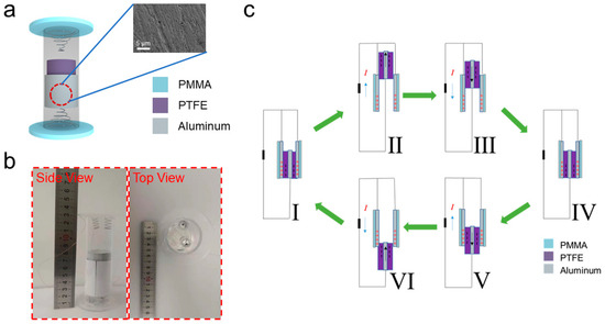The structural configuration of the CS-TENG is depicted in Figure 1a. An inner cylinder was coaxially assembled with an outer tube, and the inner cylinder could slide freely within the tube. Two springs were fixed on both ends of the outer tube so that the inner cylinder could be bounced back and forth when the CS-TENG was in operation. AO-treated aluminum film was stuck onto the inner wall of the outer polypropylene tube, and served as the positive electrode. The AO treatment could increase the roughness of the aluminum film effectively, as indicated by the inset SEM image in Figure 1a. The AO approach has been widely used in previous studies to modify aluminum foils [34,35,36]. PTFE film was pasted onto the outer wall of the inner aluminum cylinder, and served as the negative electrode. The working principle of the CS-TENG was based on sliding triboelectrification at the interface between the PTFE layer and aluminum layer. The inner diameter of the outer tube was 34 mm, the outer diameter of the inner cylinder was 32 mm, the thickness of the PTFE film was 0.2 mm, and the thickness of the aluminum film was 0.4 mm. Thus, the two layers were controlled to have a tiny gap (about 0.4 mm), in order to allow the cylinders to move freely in a coaxial 1D motion and still be able to abrase with one another during the movement. Two copper wires were connected to the inner cylinder and the aluminum film was attached to the outer tube as current leads, in order to direct the generated current to the outer circuit. Figure 1b shows the overall size and appearance of the assembled CS-TENG device from the side view and the top view.