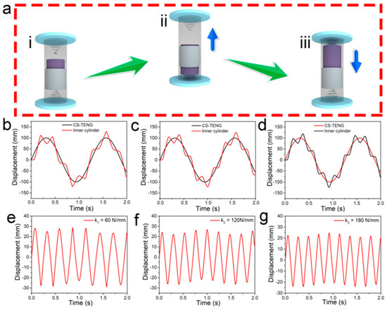 The motion trajectories (displacements) of the CS-TENG device and the inner cylinder are shown in Figure 2b–d for the use of springs with different stiffness coefficients. The simulated results revealed that the inner cylinder, which was wrapped in the PTFE film, exhibited an oscillating behavior, while the whole device underwent a sinusoidal motion. It was found that the overall displacement of the whole device remained the same when using different springs, but the reciprocating motion frequency of the inner cylinder was gradually increased as the stiffness coefficient of the springs was enhanced from 60 N/mm to 180 N/mm. By normalizing the displacement of the inner cylinder with the displacement of the whole device, it was easier to observe the changing trends of the inner cylinder as the stiffness coefficient of the springs was increased. As shown in Figure 2d–f, the inner cylinder showed a periodic movement pattern with little fluctuation. The normalized displacement represents the distance between the center of gravity of the inner cylinder and the outer tube. It was found that this displacement gradually decreased with the increase of the stiffness coefficient of the springs. This was because greater counterforce was exerted on the inner cylinder when it impacted on a stiffer spring with a certain momentum, leading to smaller compression of the spring and a greater adverse acceleration speed. Therefore, stiffer springs in the CS-TENG would cause a faster motion but a shorter motion distance to the inner cylinder. It is believed that this movement phenomenon would greatly affect the triboelectric output performance of the CS-TENGs. The following section provides a concise and precise description of the experimental results, their interpretation, and the experimental conclusions that can be drawn from them.