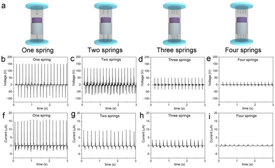 (a) Prototype designs of the CS-TENGs with different numbers of springs, reflecting the difference in stiffness coefficient. (b–e) Output voltage results of CS-TENGs with 1–4 springs fixed on each end of the device. (f–i) Output current results of CS-TENGs with 1–4 springs fixed on each end of the device.