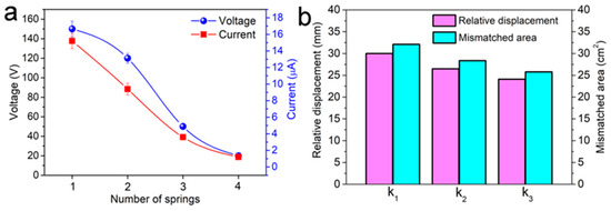 (a) Output voltage and current statistical results for the CS-TENGs with different numbers of springs fixed on each end. (b) Simulation results for the maximum relative displacement and the mismatched area between the inner cylinder and the outer tube for the CS-TENGs equipped with springs with increased stiffness coefficient.