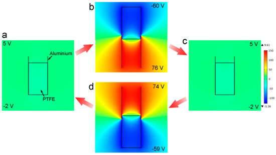 In addition, COMSOL Multiphysics software was used to simulate the potential field distribution of the CS-TENGs in different operating states. As shown in Figure 5, the potential difference between the top region and the bottom region was only 7 V when the CS-TENG devices were in the matched state (Figure 5a). Although the electrostatic field was insignificant, charge transfer occurred when the aluminum film was in contact with the PTFE film. Hence, a great potential difference could be generated when the inner cylinder and the outer tube moved away from one another. It was found that a high voltage difference of 136 V could be generated when the PTFE film attached to the inner cylinder was moved upward such that it departed from the aluminum film stuck to the inner surface of the outer tube (Figure 5b). The CS-TENG devices would adopt a relatively neutral state when the inner cylinder moved back to the matched state (Figure 5c), and the electrostatic field would be reversed when the inner cylinder was moved downward beneath the aluminum film (Figure 5d). The simulation results verified that a great electrostatic field would be created periodically as the inner cylinder slid up and down in the region confined by the outer tube, due to the triboelectric difference between the PTFE film and the aluminum film attached to the inner cylinder and the outer tube, respectively.