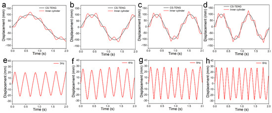 One of the most important external factors in the CS-TENGs’ operation is the vibration frequency of the devices, while the effect of sliding mode TENGs’ vibration frequencies on their energy output performance is not yet fully elaborated. In this study, the CS-TENGs’ operation under different frequencies was also simulated using ANSYS finite element analysis. In the simulation, the motion frequency of the virtual model was set at 3 Hz, 4 Hz, 5 Hz, and 6 Hz; the motion amplitude was fixed for all cases, and the total displacement and the relative displacement results were analyzed accordingly. As shown in Figure 6a–c, it was clear that the motion frequency of both the CS-TENG devices and the inner cylinder was greatly enhanced with the increase of frequency from 3 Hz to 5 Hz. Interestingly, it was found that although the displacement of the CS-TENGs was fixed at 100 mm for all cases, the relative displacement between the aluminum film and PTFE film gradually increased as the operating frequency increased (Figure 6e–g). However, when the motion frequency was increased to 6 Hz, the relative displacement between the aluminum film and the PTFE film was approximately the same as that at 5Hz, while the motion frequency of the inner cylinder was clearly increased (Figure 6h). This implies that the compression degree of the springs might have reached its maximum level when the vibration frequency of the CS-TENGs exceeded 5 Hz. Therefore, further increases in vibration frequency would not enhance the relative displacement, but would increase the motion frequency and velocity of the inner cylinder.