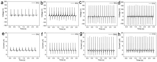 (a–d) Output voltage results for CS-TENGs when operated vertically at a vibration frequency of 3–6 Hz. (e–h) Output current results for CS-TENGs when operated vertically at a vibration frequency of 3–6 Hz.