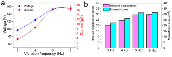 For easy comparison, the statistical data is plotted in Figure 8a. We found that the output voltage increased from 97 V to 153 V and the output current increased from 3.7 μA to 16.2 μA when the vibration frequency was enhanced from 3 Hz to 5 Hz. The voltage and current remained at the same levels when the vibration frequency was increased from 5 Hz to 6 Hz. The finite element simulation results (Figure 8b) revealed that the relative displacement and the mismatched area between the inner cylinder and the outer tube increased when the frequency was increased from 3 Hz to 5 Hz, while it remained about the same when the frequency was further enhanced to 6 Hz, which is consistent the experimental results. These results demonstrate that the peak output voltage and current of the CS-TENGs were mainly affected by the relative displacement between the negative PTFE film and the positive aluminum film, rather than the frequency or the motion velocity. However, the energy generation frequency could be significantly increased with the increase in operating frequency, due to the reactive force applied by the springs. Therefore, the results and basic conclusions obtained from this study may provide valuable directions for the design of sliding mode TENGs containing springs, as well as guidance for the optimization of their output performance.