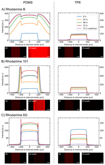 To assess the absorption of small molecules into TPE, a comparative study against PDMS was performed. Three different rhodamine dye molecules, with similar molecular weights (479–491 g/mol), were used to account for the effect of different hydrophobicity (2.13 ≤ Log P ≤ 7.8) [48]. Dye solutions were injected into the microchannels, and the fluorescence profiles in the microchannels were monitored at different time points (Figure 3).