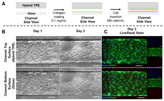 In order to assess the suitability of the presented PC/TPE-hybrid material for microfluidic cell culture systems, HUVECs were seeded into the channels of PC/TPE-glass microfluidic devices and cultured for three days (Figure 4A). Bright-field microscopy at day 1 and day 3 revealed cell attachment to both glass and TPE surface as well as a physiological phenotype of the cells (Figure 4B), indicating that the material was not toxic to the cells. This observation was confirmed by live/dead staining performed on day 3, demonstrating almost no dead cells on both surfaces (Figure 4C).