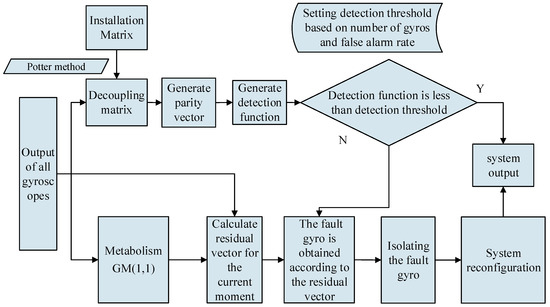 Figure 2 illustrates the process of fault detection and isolation of the multi-gyro system using the generalized likelihood test method and RE-MGM. The system obtains the decoupling matrix V through the Potter method according to the installation matrix H. According to Equation (4), the parity vector g of the measurement output vector at the current time is obtained. Then, the value of the fault detection function at the current time is calculated according to Equation (11). Simultaneously, the gyro output generates the prediction sequence through the metabolism GM(1,1) and calculates the residual vector. The system calculates the detection threshold according to the number of gyros and the false alarm rate and compares it with the fault detection function’s value. If there is no fault, the system will output normally. If the fault is judged, the fault gyro is judged according to the residual vector, and the system is reconstructed. Then, send the reconstructed output.