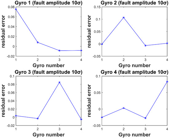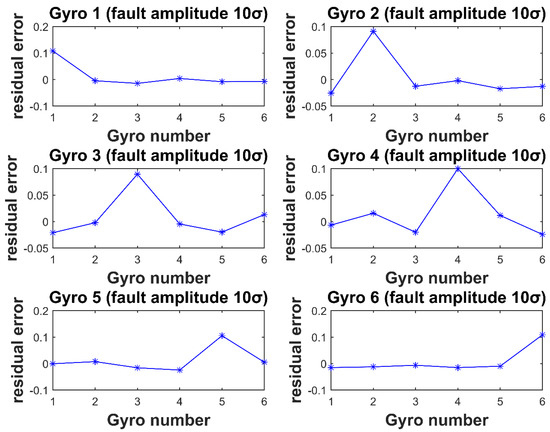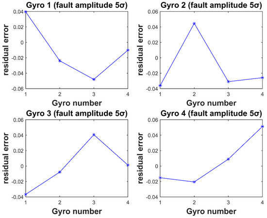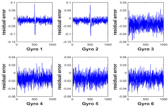 In the residual vector, the values corresponding to fault-free gyros should be distributed near zero, and the values corresponding to fault gyros will deviate significantly from zero. The residual vectors’ elements are sorted in descending order, and the gyro corresponding to the first element in the order is the gyro with fault.