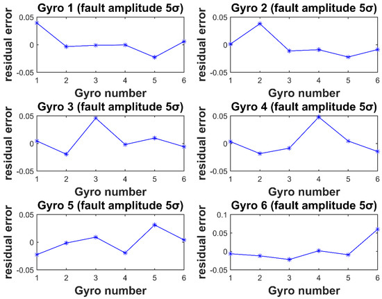 The simulation parameters are consistent with the four-gyro system. Inject fault one by one to six gyros of the system. As shown in Figure 5 and Figure 6, injecting fault to six gyros, respectively. For the gyro with injection fault, the corresponding element value of the residual vectors is the largest. Thus, the fault gyro can be isolated.
