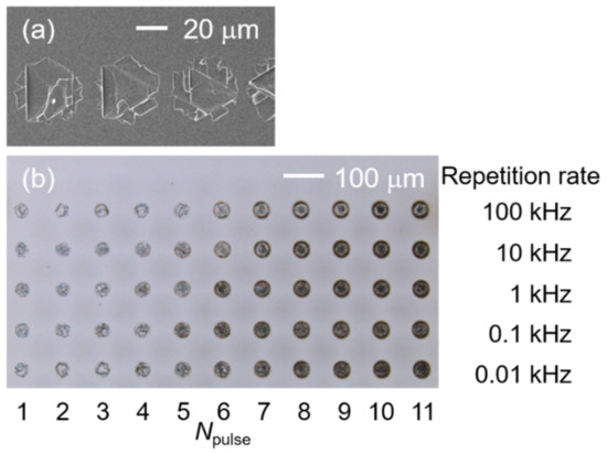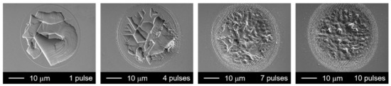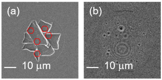 Figure 1a shows the one-pulse irradiated ZnO substrate surface of our work; this is a very interesting morphology that differs from the laser-irradiated surface of the silicon (Si) substrate or some other metal materials [20,21,22]. As shown in Figure 1b, in general, these one-pulse irradiated marks on Si or other metal surfaces are considered to be caused by melting with heat. On the contrary, no melting was observed from the one-pulse irradiated spot of the ZnO substrate; instead, corners with a 120° angle (pieces from broken hexagon patterns) are observed.
