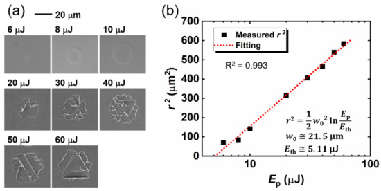 where Ep is its pulse energy, and Eth is the ablation threshold energy. Based on our SEM images, we measured the ablation areas of the one-pulse irradiated spots (shown by black squares in Figure 3b) and obtained the r2 value. The red broken line in Figure 3b shows the fitting curve described by Equation (2); according to the simulated values of Eth (5.11 μJ) and w0 (21.5 μm), we can obtain the ablation threshold, Fth = 0.35 J/cm2.