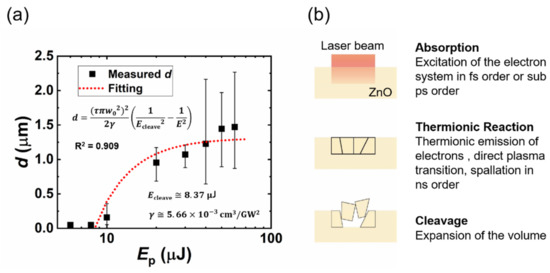 where d is the cleavage depth, τ is the pulse duration (700 fs), w0 is the focused radius (21.5 μm, simulated by Figure 2b), Ecleave is the threshold energy of laser-induced cleavage for our processing system, and Ep is the energy of incident laser pulse. The measured cleavage depth was fitted based on Equation (5) and shown in Figure 4a. The 6-μJ irradiated spot was neglected for the fitting because the intensity may be too low to encourage multi-photon absorption [34]. The fitting curve agrees well with the measured results, and we obtained a simulated value of Ecleave (8.37 μJ) indicating the minimum pulse energy for laser-induced cleavage. The simulated γ in our work is 5.66 cm3/GM2, which agrees with the result measured by He et al. The thermal properties also contribute considerably to the cleavage process; ZnO has a higher thermal-expansion coefficient (α⊥~5 × 10−6 K−1, α//~3 × 10−6 K−1 [35,36,37] and a much lower thermal conductivity (κ < 50 W·m−1·K−1 [37,38,39,40]) than Si (α~2.6 × 10−6 K−1 [41,42,43], κ~150 W·m−1·K−1 [41,44]) at a temperature of ~300 K. These thermal properties indicate that a larger expansion in a smaller volume will be induced by laser irradiation in the ZnO substrate than in Si.