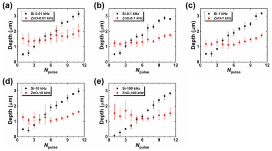 Depths of the multi-pulse irradiated spots of ZnO (red squares) and Si (black squares) under different repetition rates in the range 0.01–100 kHz (a–e).