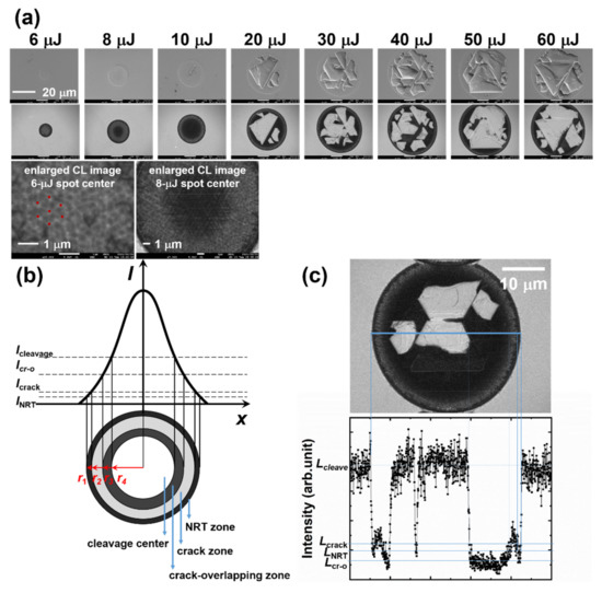 where Icleavage is the intensity for inducing the cleavage, and Icr−o is the intensity for inducing the crack-overlapping zone. Here, Icleavage and Icr-o should be a constant for a settled processing system and a specified material, indicating that the crack-overlapping zone should have an immutable area Scr-o in an ideally cleaved spot. In the same way, Scrack and SNRT can also be obtained as and , respectively, and independent to the energy of the incident laser pulse. The immutability of such areas suggests that an ideally cleaved surface should have a constant intensity of CL luminescence.