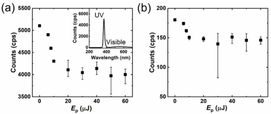 The luminescence properties of ZnO have been reported in detail on numerous occasions [45,46,47,48,49,50,51,52,53,54]. The consensus is that UV luminescence should be attributed to the near-band emission, but the visible luminescence associated with various intrinsic defects can show various wavelengths. Figure 8 shows the intensity of the UV (a) and visible (b) peaks of the one-pulse irradiated samples according to their CL spectra. For the one-pulse irradiated samples, UV emission appeared at 371.5 ± 0.3 nm with a full width at half maximum (FWHM) of 16.3 ± 0.2 nm, while the green peak appeared at 549.3 ± 8.0 nm with an FWHM of 179.2 ± 2.8 nm. For the bulk surface, UV emission appeared at 371.6 ± 0.3 nm with an FWHM of 16.3 ± 0.0 nm, while the green peak appeared at 556.4 ± 5.6 nm with an FWHM of 177.5 ± 1.8 nm. The green luminescence in our ZnO samples has a similar wavelength to the reports by Zhang et al. [43] and Camarda et al. [53]; it is related to the defects of the ionized oxygen vacancies. For both UV and green luminescence, a decrease process was observed when Ep < 20 μJ; for higher pulse energies, the intensity randomly changed with the pulse energy. When Ep ≥ 20 μJ, the intensity changed randomly, but the average intensity remained at a relatively constant level, which was decreased dramatically from the bare ZnO substrate (Ep = 0 J) to Ep = 20 μJ.