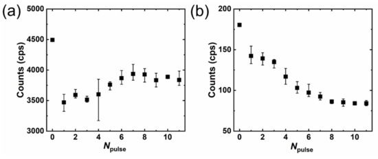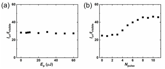 Figure 9 shows the UV–green ratio of luminescence intensity; for one-pulse irradiated samples (Figure 9a), this ratio showed a smooth distribution with almost no change as the pulse energy increased. On the other hand, the ratio of multi-pulse irradiated samples (Figure 9b) started to increase after four pulses and saturated at eight. This suggests that the surface-defect state is not overly affected by the pulse energy in the one-pulse irradiated samples, but can be changed by multi-pulse irradiation. Figure 10 shows the UV (a) and green (b) peak intensities of CL luminescence for the multi-pulse irradiated samples. For these samples, UV emission appeared at 372.2 ± 0.4 nm with an FWHM of 17.0 ± 0.6 nm, while the green peak appeared at 543.1 ± 4.9 nm with an FWHM of 172.3 ± 3.3 nm. The UV intensity dramatically decreased for the first pulses due to a sudden increase in the crack-overlapping, crack, and NRT zones. The UV intensity randomly changed from one to three pulses, continued increasing from four to seven pulses, and saturated at eight pulses. On the other hand, the intensity of the green peak kept decreasing until saturating at eight pulses. This result indicates that the defects contributing to green luminescence decreased with the pulse number. Because the similar depth change via Npulse was obtained for the samples irradiated with a repetition rate from 10 Hz to 100 kHz (Figure 6), an increasing and then saturating process of Iuv/Ivisible (Figure 9b) can also be predicted for the samples irradiated under repetition rates from 100 Hz to 100 kHz.