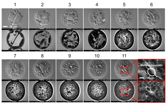 Although the one-pulse irradiated spots showed cleavage marks if the pulse energy was higher than the threshold energy, the laser-induced cleavage did not remain when the same spot was irradiated by multiple pulses. As shown in Figure 5, when the pulse number reaches four, the conspicuous melt is deposited on the no-cleavage zone, and the melt area increases with pulse number. Consequently, the 10-pulse irradiated spot becomes a fully melted surface. This cleavage–melt shift was found for all of the samples under different repetition rates according to their CLSM measurements, and it may be caused by the vestigial heat from the initial laser–matter interaction or the change in absorption related to the surface defect arising from previous irradiations. As shown in Figure 6, the depth of the laser-irradiated Si increases almost linearly with the number of pulses. This linear increase indicates that there is no mechanistic change in the ablation process as the pulse number increases. The melting process consistently accompanies the increase in laser pulses. On the other hand, the depth of the laser-irradiated ZnO seems to be randomly distributed for pulse numbers less than five, and from the fifth pulse, the depth linearly increases with the laser-pulse number. The cleavage–melt shift occurred for all samples with laser repetition rates from 10 Hz to 100 kHz. However, the repetition rate is associated with the waiting time for the next pulse, which will vary the cooling time for the irradiated spot between pulses. Hence, when the repetition rate is low enough, the longer cooling time is possible to change the formation process of the surface defect. Therefore, the change in repletion rate may not affect whether the melt–cleavage shift happens, but it is possible to shift the Npulse where the melt-cleavage shift was induced.