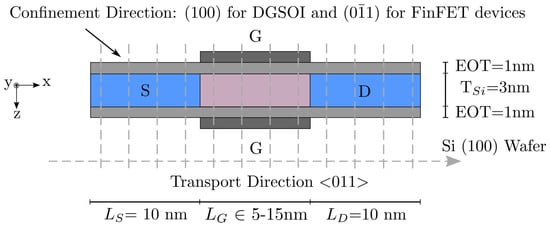 Schematic illustration of the Si DGSOI and FinFET structures with ranging from 5 nm to 15 nm. The rest of the parameters remains fixed: source length ( = 10 nm), drain length ( = 10 nm), Si thickness ( nm), and Equivalent Oxide Thickness (EOT nm). The confinement direction for these devices on standard wafers [100] changed from (100) for DGSOI to () for FinFET, whereas the transport direction <011> was the same for both. 1D Schrödinger equation was solved for each grid point in the transport direction, and BTE was solved by the MC method in the transport plane.