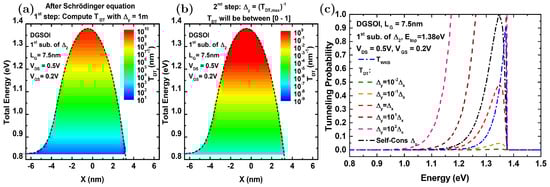 If one neglects this theoretical issue and limits to the practical domain where the energy barriers of interest provide finite values of , one might recover self-consistency (recall the first concern listed above) by using as a normalization parameter that restores the maximum value of the tunneling probability to one. The procedure consists of two successive steps illustrated with an example in Figure 3. At first, after solving the Schrödinger equation in each time step, we computed taking m. This led to a function that typically increased with for each subband (Figure 3a). Immediately thereafter, we took the maximum of this initial estimation of and defined as its inverse (Figure 3b). These calculated probabilities were then between 0 and 1 (as illustrated by the color scale in Figure 3b). We also considered and plotted, for comparison, the curves corresponding to alternative and pre-established values of (Figure 3c). It is obvious that, for those predefined values of , the maximum values of their counterpart curves do not correspond to 1.