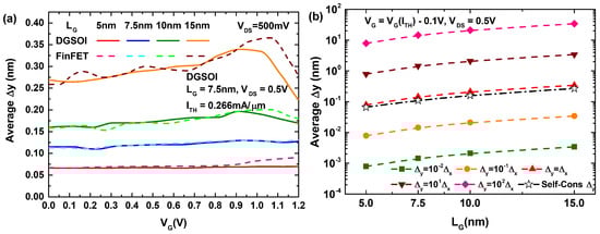 (a) Behavior of the average self-consistent estimation as a function of for the DGSOI and FinFET with ranging from 5 nm to 15 nm. (b) Effect of gate length increase on the different definitions (self-consistent and dependent on ).