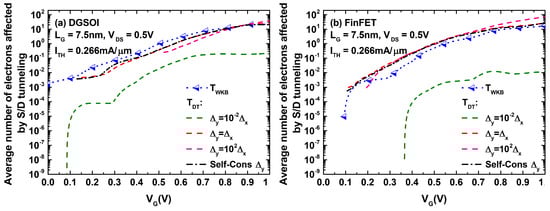 As immediately understood from Equation (2), different choices of have a direct effect on the resulting value employed in our simulations. This, in turn, would affect the number of superparticles affected by S/D tunneling. Figure 5 shows the average number of electrons tunneling from the source to drain as a function of the gate biasing when both devices have a gate length of nm and feature the same threshold current. In some cases, the number of tunneling electrons computed using exceeded their WKB counterpart. This is particularly noticeable for the FinFET structure.