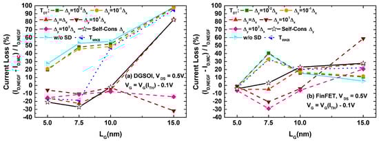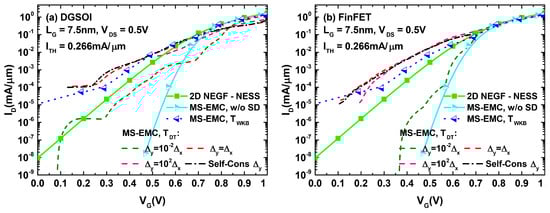 These results could then be extrapolated for analyzing their effect on the characteristics of both devices. The corresponding plots are displayed in Figure 6. A close inspection of the different curves for both devices indicates that the main differences between the set of curves corresponding to S/D tunneling computation in MC and the one obtained from NEGF calculations arose for current levels below the threshold reference. This behavior discrepancy disappeared when the devices entered the ON regime. With the objective of quantifying the current deviation between MS-EMC and NESS in the subthreshold regime, we selected for each analyzed curve a gate voltage V below that corresponding to . For this gate bias, we depict in Figure 7 the current loss defined as . We observed how, for values of , the reported losses approached those corresponding to the situation without tunneling. On the other hand, for gate lengths for which S/D tunneling became significant ( nm), the cases with exhibited a negative current loss or, in other words, an overestimation of the tunneling contribution in MC (). The self-consistent choice of (leading to ) reports the closest resemblance to the current levels obtained from NEGF. Nevertheless, the percentage variations remained noticeable in this case.