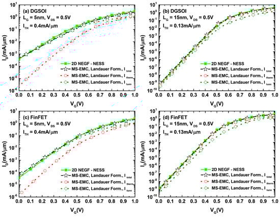 characteristics for the DGSOI and FinFET with the shortest and longest gate lengths considered in our work, respectively: (a) DGSOI with nm, (b) DGSOI with nm, (c) FinFET with nm, and (d) FinFET with nm. The plots compare the results from NEGF with those from MS-EMC employing the Landauer approach for the current computation. The total current reported from MS-EMC was also broken down into its tunneling and thermionic contributions.