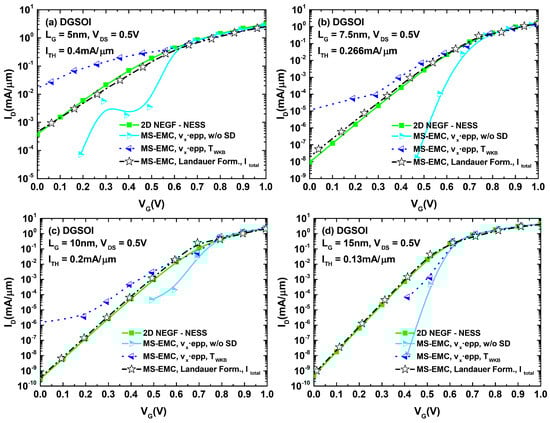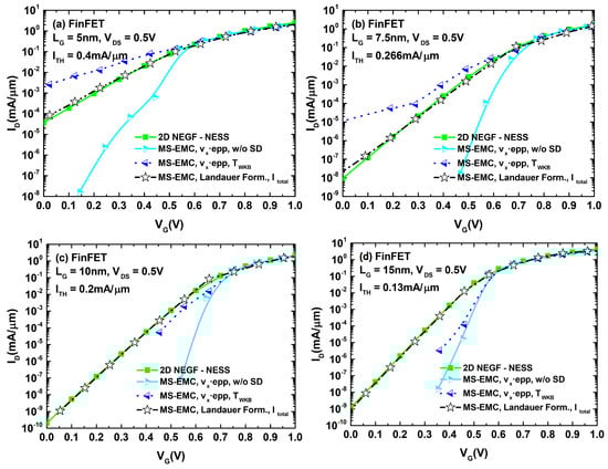 characteristics for the FinFET with different gate lengths: (a) nm, (b) nm, (c) nm, and (d) nm. Analogously to the DGSOI, the displayed current curves correspond to: NEGF, MS-EMC with the standard current computation (with and without S/D tunneling), and MS-EMC using the Landauer approach.