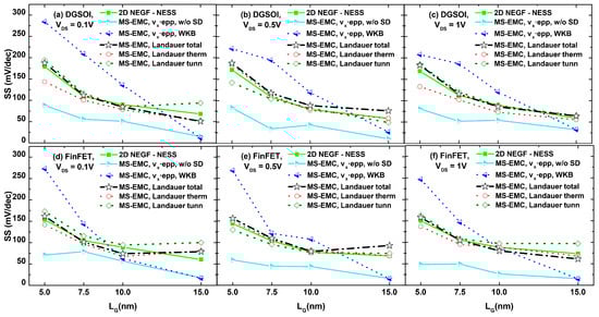 Subthreshold swing values (SS) as a function of the gate length for the DGSOI and FinFET considering different drain voltages: (a) DGSOI with V, (b) DGSOI with V, (c) DGSOI with V, (d) FinFET with V, (e) FinFET with V, and (f) FinFET with V. Current computation corresponds to the different techniques analyzed in our work: NEGF, MS-EMC with the standard approach (with and without S/D tunneling), and MS-EMC incorporating Landauer.