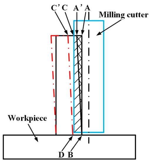 The reason of machining error is shown in Figure 1 []. The materials of shadow part ABCD should be removed in theory when the end milling cutter is used to mill thin walls. But thin walls produce elastic deformation due to cutting forces, resulting in that two points A and C move to A’ and C’, respectively. Therefore, only the A’BCD part materials were removed by milling cutter. The elastic deformation of thin wall parts recovered after milling cutter leaves thin wall parts, and some residual C’CD materials are not removed, resulting in the wall thickness processing error. Consequently, the thickness at the top of the thin wall is greater than the thickness at the bottom of the thin wall. Therefore, the machining error of thin wall parts is mainly the fact that the cutter cannot remove all the materials due to the machining deformation of thin walls. If the deformation of the thin wall can be identified, the residual material can be removed by means of CNC machining compensations. Therefore, the key to solve the machining error of thin wall parts is to obtain the deformation values of the workpiece under the specific machining conditions.