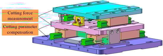 Figure 2 shows the three-dimensional structure diagram of the designed cutting force measurement and cutting parameter compensation device. It is mainly composed of two parts, the cutting force measurement part and the cutting parameter compensation part. The cutting force measurement part is composed of a piezoelectric sensor, two guide rails and sliders. The resolution of the piezoelectric sensor (Model: 6023, ARIZON, Changzhou, China) is 0.001 N and the comprehensive accuracy is 0.005 N. The cutting parameter compensation part is composed of a linear motor (Model: AJM50, Akribis, Shanghai, China), two guide rails and sliders, and a grating ruler (Model: RGH41, RENISHAW, London, England). The resolution of the motion system is 0.1 μm.
