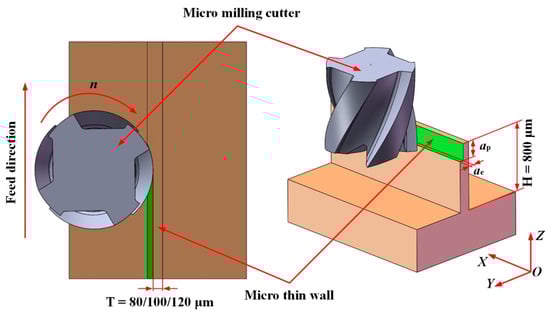 The feed per tooth is directly related to the phenomenon of minimum cutting thickness, and has a great influence on the micro milling force and machining quality due to the size effect in the micro milling process. Therefore, the feed per tooth is an important parameter in the micro milling process. In this study, the main purpose is to study the relationship between milling force and deformation of the thin wall. Considering the size effect in the microcutting process, the nonlinear force increase due to ploughing should be avoided. Therefore, the feed per tooth is greater than the minimum undeformed chip thickness. At the same time, excessive feed per tooth values are not suitable to be selected, otherwise it will make the cutting force increase, leading to larger deformation of thin walls. Therefore, the thin wall cutting parameters are determined as shown in Table 3 based on previous studies [,,,,,].