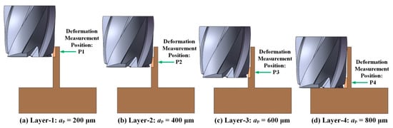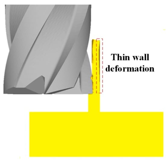 The large deformation of thin walls with high aspect ratio finishing by micromilling is a challenging research topic. The serious elastic deformation recovery after the processing results in the size, shape, and position error of the thin wall workpiece []. The stiffness of thin wall parts decreases gradually from the bottom to the top. Therefore, the deformation at the top of the thin wall is greater than that at the bottom when the same cutting parameters are used in the machining process. The final processed thin wall parts would form a situation where the thickness at the top of the thin wall is greater than that at the bottom. However, this phenomenon would be significantly reduced if layered milling strategies are carried out. The residual material is hard to remove by a milling cutter in the cutting process due to machining deformations, which require repeated finishing, leading to low processing efficiency and possible repositioning errors. Therefore, it is a hot research topic of deformation compensation according to the predicted machining deformation in the machining process.