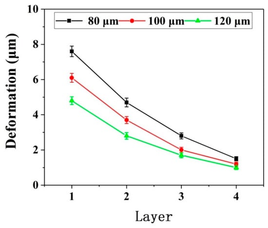 Considering that the stiffness of thin wall parts decreases from the bottom to the top, layered simulation is carried out for axial cutting to study the relationship between deformation amount and the number of axial layers, as shown in Figure 6 []. Three kinds of H59 Brass thin wall parts with the height of 800 μm and thickness of 80 μm, 100 μm, and 120 μm are simulated respectively under the same cutting parameters using the established finite element simulation model, and the change law of cutting force and deformation in the process of milling is analyzed.