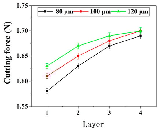 However, the model of each layer is different in the simulation process. When the next layer is simulated, the material of the upper layer is set to be completely removed. Therefore, the error between the simulated cutting force and the experimental one is constantly increasing with the increase of the number of cutting layers due to the above reasons.