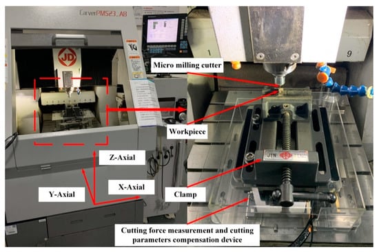 The CNC micromilling machine tool CarverPMS23_A8 (Beijing Jingdiao, Beijing, China) is selected to conduct the contrast experiments, as shown in Figure 10. The maximum rotation speed of spindle is 36,000 rpm. The cutting force measurement and cutting parameter compensation device is fixed on the worktable of the machine tool. The workpiece is fixed on the proposed device through the clamp. The cutter, workpiece, and cutting parameters used in the experiment are consistent with those in the simulation.