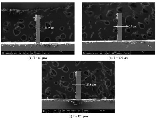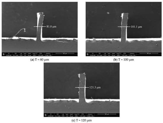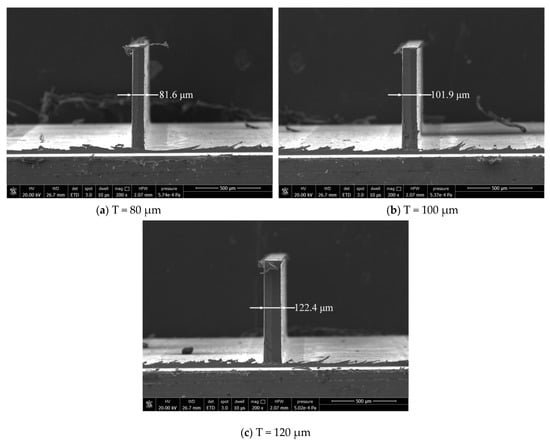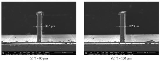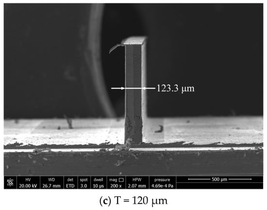 The dimensional error has some difference between the actually machined thickness and the ideal one of the thin wall. The actual thicknesses of thin walls are measured by scanning electron microscope (Model: Quanta 250, FEI, OR, USA) after milling. Thin wall thickness can be evaluated by measuring 4 thicknesses along the wall, Figure 11 and Figure 12 show the thin wall thickness measurement results without and with compensations, respectively. The standard deviations of the measured values can be calculated by Equation (1). Table 7 shows the thin wall relative dimensional errors results.
