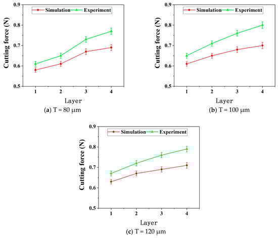 As can be seen from Figure 13, both the simulated cutting forces and the experimental cutting forces of the three thin walls with different thicknesses increase with the increase of the number of axial layers. Meanwhile, with the increase of the number of layers, the error between the simulated cutting force and the experimental one gradually increases. Possible reasons are discussed as follows.