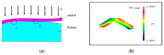 (a) Contact surface of the mirror and the fixture (I is the non-contact area, II is the contact area) and (b) the clamping deformation of a weak-stiffness mirror.