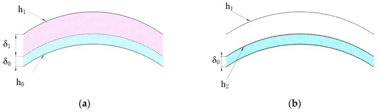 As the contact surface between the mirror and the fixture is not an ideal plane, there is a contact area and a non-contact area, as shown in Figure 2a. Therefore, a large clamping force is generated during the clamping process, which will lead to clamping deformation on the machined surface [22]. Figure 2b shows the clamping deformation of a weak-stiffness mirror obtained through experimental measurement. Different colors represent different heights. The maximum height was about 2.4 µm, the minimum height was about −2.8 µm, and the PV value was about 5.2 µm. Clamping deformation includes elastic deformation and plastic deformation. Elastic deformation will recover after the removal of the fixture, while plastic deformation is a permanent deformation that cannot be recovered. As shown in Figure 3a, h0 is the mirror surface before clamping. After clamping, the elastic deformation δ1 and the plastic deformation δ2 are produced. h1 is the mirror surface after clamping. As in Figure 3b, after removing the fixture, the elastic deformation δ1 recovers, while the plastic deformation δ2 is still present. h2 is the mirror surface after springback.